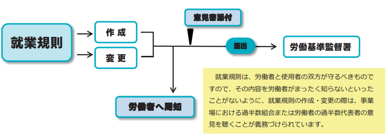 常時10人以上の労働者を使用している事業場では、就業規則を作成し、過半数組合または労働者の過半数代表者からの意見書を添付し、所轄労働基準監督署に届け出る必要があります。また、就業規則を変更した場合においても同様です。